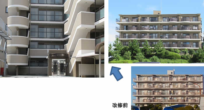 ◇単調で漠然とした印象の集合住宅が、適切な明度・彩度のコントロールにより丘陵地にふさわしい落ち着いた印象の建物に変貌した。表情の異なる左右の建物をつなぐ役割を果たし街並みの連続性を実現している。